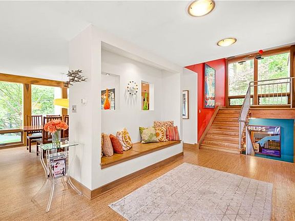 This is the iconic Mid-Century Modern home of your dreams, designed by John Knox Shear! The architectural style is reminiscent of the legendary Falling Water. Corrugated steel siding paired w/ stacked stone, floor to ceiling windows & roof top deck immediately capture your attention. Once you walk inside you'll want to sit in front of the fireplace, gaze out the wall of windows & relax, soaking in nature's beauty. The open floor plan practically begs you to host parties. From the viking stove you can prepare feasts while chatting w/ guests in the dining rooms. The secluded decks offer spaces for relaxing & dining. Admire the view from the roof top deck. Entertain in the outdoor courtyard or play in the sports court. Unwind in the owner's suite w/ walk-in closet & spa-like ensuite. 3 additional bedrooms share an updated bath. The mid level features a full bath laundry room & 2 car garage.The lower level features a huge finished game room, 2 home offices, gym or storage room & full bath.