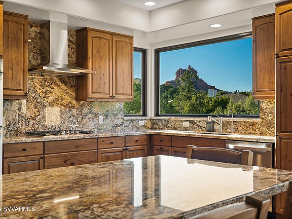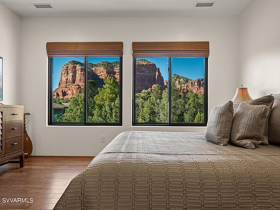 Experience breathtaking red rock views from every angle in this stunning custom-built home, nestled in a tranquil and picturesque setting. The spacious open-concept great room and thoughtfully designed split bedroom layout showcase the majestic beauty of the surrounding landscape. Immerse yourself in luxury with beautiful alder cabinetry, granite countertops, engineered birch wood flooring, and Italian porcelain tile accents in bathrooms and laundry room. Elegant finishes and fixtures perfectly complement the contemporary rustic aesthetic of this residence. Step outside onto the expansive outdoor deck and be enveloped by panoramic vistas of red rocks, towering trees and the natural splendor of the seasonal wash. Admire the unique touch of a custom-made artistic red rock boulder mailbox post, adding charm and character to the property. Completed in August 2019, this home is built on a solid foundation with ample storage space accessible below. Experience the epitome of refined living amidst the awe-inspiring backdrop of red rock beauty.