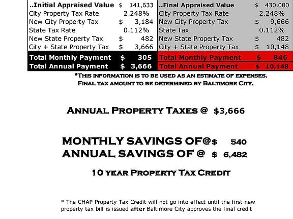 10 YEAR CHAP credit PENDING (based on $140,000 initial appraised value, awaiting final approval) 3bedroom and 3 bathroom renovation with 2 CAR PARKING. Fully renovated with premium finishes, while preserving its historic beauty, this property features exquisite attention to detail. Open and inviting floorpan, gorgeous accent wall, exposed brick, modern fireplace with a custom reclaimed wood beam, matte finish hardwood floors, chef's kitchen with incredible layout, premium quartz countertop, along with BONUS sitting room of the kitchen with a walk out to your own city garden (blank canvas for the gardening lovers). Second floor features incredibly spacious and airy layout, beautifully restored historic trim and transoms over all doors, offering a large master suite, designer bathroom with a freestanding soaking tub, posh Italian Calcutta tile , large walk-in shower with crackle glaze green subway. There is also a guest bedroom and bathroom, leading you out to a large deck. Lower finished level offers a bright and sunny bedroom and full bathroom. Awesome location in Highlandtown, close to all that Baltimore downtown offers, Johns Hopkins Hospitals, as well as an easy access to restaurants, shopping and to major highways. Complete rehab with brand new HVAC, electric, plumbing and roof. CHAP tax credit translates into approximate $540 per month savings (see the worksheet).
