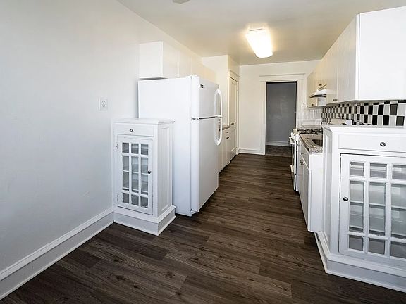 Prepare your favorite meals in the crisp white kitchen, boasting abundant cabinet space, white appliances including a gas range and full-size refrigerator, and sleek granite-look countertops. The striking black and white checkerboard backsplash adds a touch of classic charm.