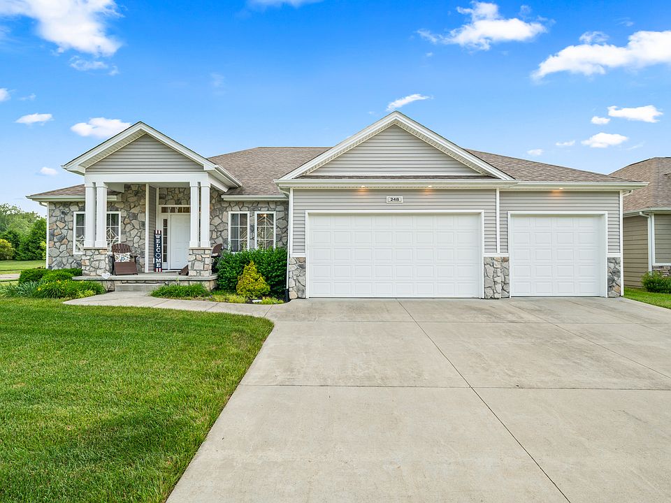 Welcome to 248 Westbrook! Built by the award-winning Spoon Construction! Situated on a corner lot in Tipton Lakes, giving you access to all of the amenities that Tipton has to offer! As you walk inside you'll find top-tier craftsmanship everywhere. The main level has 2 guest bedrooms plus the primary bed with a beautiful ensuite bathroom, walk-in closet, and a nice 3 car garage. The main floor laundry room is conveniently located directly off the primary suite. In the kitchen, you will see high-quality custom cabinets, a center island, and granite countertops! Recent upgrades include a new gas cooktop along with a new stainless steel refrigerator and dishwasher. Just off of the kitchen is a dining area where you could enjoy a morning breakfast with a view of the backyard. The living room has coffered ceilings, built-in bookshelves, and a gas fireplace. Going downstairs you will find yourself in a finished basement that includes a guest bedroom with a full bathroom, a home theater room with included hi-def projector and surround sound, and a massive living area! Also downstairs is an unfinished area that is perfect for dry storage. The home is freshly painted throughout. Conveniently located close to the new proposed elementary school and nearby churches. Schedule your showing today!