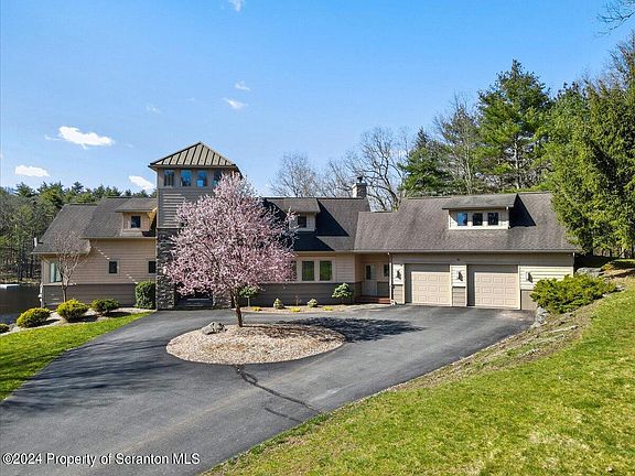 Awaken each morning on the mahogany master balcony to the gentle embrace of cool mist and the harmonious symphony of songbirds, all while taking in sweeping vistas of nature's grandeur. Crafted in 2007 with uncompromising attention to detail, this architectural masterpiece showcases the pinnacle of modern engineering excellence. Featuring the unique Tara Fort Dachs design, the residence boasts a one-of-a-kind layout that seamlessly integrates with its breathtaking surroundings, offering enchanting views of the nearby lake from virtually every room. Delight in the sheer splendor of the Great room's expansive glass wall and the panoramic vistas afforded by the fourth-floor 360 belfry. Generously appointed bedrooms, ample closet space, and versatile hobby areas ensure that guests are treated to the utmost comfort and convenience. For added privacy, the full in-law suite beckons with its own complete kitchen and recreation space, promising a retreat that's both indulgent and inviting. Whether accommodating guests in spacious bedrooms with ample closet, this home caters to every need. All protected by the added feature of a whole house fire suppression system for complete piece of mind. Just seven minutes away, you will find The Lodge at Woodloch. The Lodge is a luxurious adults-only spa resort, offering an array of expert body treatments, facials, massages, and salon services crafted to elevate relaxation. Embark on a family adventure across 128 acres of Woodloch Pines, hailed as USA Today's top family resort. Nestled near captivating destinations like 3 Hammers Winery and scenic Lake Wallenpaupack, indulge in the luxury of lakeside living. Lake Wallenpaupack, a sprawling reservoir spanning 13 miles with 52 miles of pristine shoreline, beckons with an array of aquatic activities--from kayaking and water skiing to jet skiing and leisurely boating. Tee off at The Country Club at Woodloch Springs. This exceptional home is located just two hours from NYC.