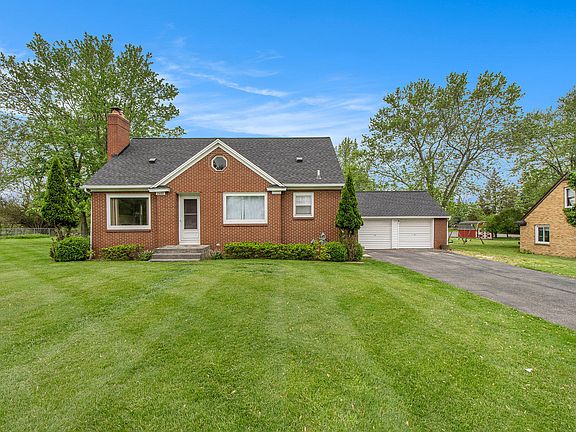 3 bedroom brick Cape Cod with huge (.9 acres) lot! New roof, central air, and attic insulation in 2024. New concrete patio in 2023. Living room has woodburning fireplace and hardwood floors under the carpet. Upper level has large bedroom with 2 built-in desks and knotty pine walls plus a half bath. Spacious 2.5 stall garage with extra storage in attic. All appliances included and immediate possession!