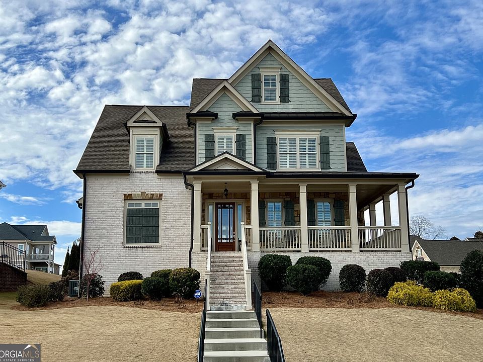 Absolutely charming home has wrap-around front porch with French doors from dining room. Perfect for an "al fresco" meal overlooking this lovely neighborhood nestled within the gates of Chateau Elan. One-owner home has been meticulously maintained and is SO clean you'll think it has never been lived in. The double oven look brand new. Sellers replaced ALL carpet with beautiful site-finished hardwood floors. All are in PERFECT condition. The sunny kitchen has a large, one-level island, bougie refrigerator, microwave drawer, and double oven. Large walk-in pantry AND butler's pantry. Kitchen is VERY open to the coffered 12' family room with ledger stone to-the ceiling fireplace surround. This room has large windows that look out to private, fenced courtyard. Master bedroom on main level features luxury bath with soaking tub/separate shower and wonderful closet with custom shelving system. Main level has 10 foot ceilings and 8' doors. Three bedrooms PLUS office/loft upstairs. Bedrooms have spacious closets. Terrace level has been completed with HVAC throughout so even the storage areas are climate controlled. This level has another full bath, family room, another office, second location with washer and dryer connections and phenomenal storage. HOA fees include ALL yard maintenance, private roads, and 24-hour manned gate. (There is a new residen't gate opening two minutes from this house next week. It will make ingress and egress to Friendship Road SO easy and FAST! Swim/Tennis fee includes privileges at the Sports Club; a 12,000 sq. ft. facility with a full gym, indoor basketball and pickleball courts, indoor walking track, fitness classes, and locker rooms with sauna and steam showers. Three car garage is accessed from rear alley. Level driveway and ONE step from garage to main level. Fresh paint on all exterior trim.