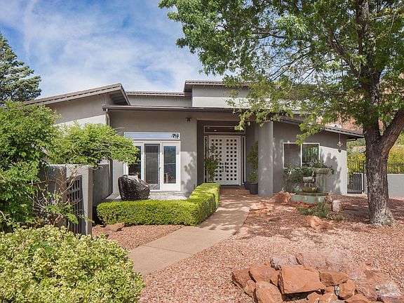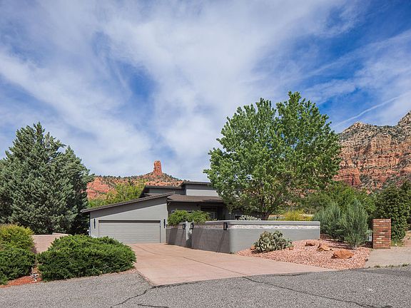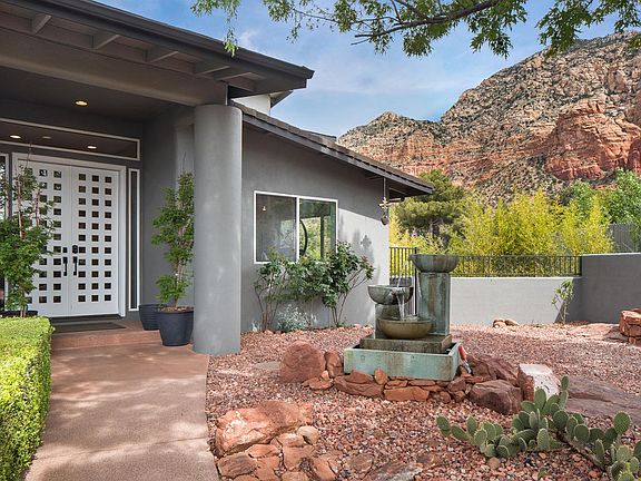 Contemporary red rock showstopper located in one of West Sedona's best neighborhoods! This NO HOA 5 bedroom 5 bathroom 3450 square foot home has ample scale, stunning red rock views that vault over the pool, hot tub and viewing deck. The TESLA Solar Power system consistently charges more than 100% of its usage and was installed in the Fall of 2018. The private fully enclosed entry courtyard has a staggering 1200 square feet and was recently upgraded with Hinkley Dark Sky Lighting to enjoy and preserve Sedona's abundant starry skies. SEVEN Car garage! 2 Car attached on the main level, the lower level has an attached RV garage (C class) that could accommodate 3 cars long.