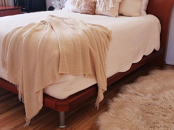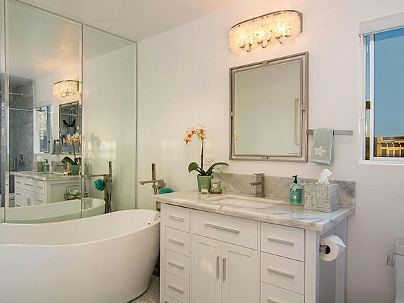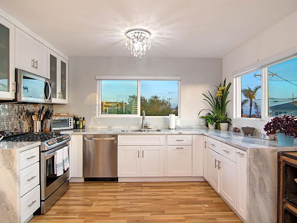 Closest rental to the bluff in Cardiff! Located right behind the "front row" of multi-million dollar homes, the waves can be heard from every room in this gem located just half a block to the bluff overlooking the beach in Cardiff! No expense was spared remodeling this upper duplex, with its gorgeous whitewater views to La Jolla! It boasts a fully remodeled kitchen with Namibia marble waterfall counters, maple floors, high end LG stainless steel appliances, custom shaker cabinets and a gorgeous chandelier. The marble bathroom includes a "Slipper" soaking tub and separate zen waterfall shower with capiz shell lighting over the custom vanity. And a jaw-dropping view of the ocean! The bedroom is furnished with a queen size plush mattress and luxury linens. A modern barn door separates the closet, and a coastal chic light feature completes the space. A separate closet includes a full-size washer and dryer. The living area is very comfortable and full of sunlight. The couch can easily accommodate two adults and the 55" Smart TV is loaded with channels and a DVR box to record your favorite shows. The location of south Cardiff-by-the-Sea boasts year-round spectacular weather! With walking trails at the nearby San Elijo Lagoon and Reserve, a world class break at Cardiff Beach, the Fairgrounds that hosts dozens of events each year including the San Diego Fair and Del Mar Thoroughbred races, there is something for everyone. Downtown San Diego's famous Gaslamp District is a 25 minute drive as is the airport. The Coaster is available and drops off in front of the stadiums for sports enthusiasts who don't wish to drive. Cardiff is upscale yet relaxed, a fantastic combination. A park with tennis, volleyball and basketball courts is a block away. There are 9 restaurants and bars within 2 blocks. Outdoor shopping, specialty shops, a gourmet market, dry cleaners, bike and surfboard rentals, etc. are all within 2 blocks. Enjoy and decompress on your own personal deck with redwood furniture, a wonderful place to see the sunset. There is also a beautiful, large shared patio full of succulents for your enjoyment and use, a fantastic place to BBQ with an ocean view! This stand alone duplex is not connected to neighbors on either side, and only one additional unit below. This location is ideal for those looking for a comfortable, beautiful and serene environment. With pre-approval, a very well behaved pet may be permitted. No smoking of any kind is permitted inside the unit or outside in the common areas. This sublet paradise is fully stocked and furnished with a beach chic vibe in mind, has 2 private off street parking spaces, all utilities, fast WIFI, a 55" Smart TV with Direct TV/DVR. It is furnished exactly as shown in the photographs, which were taken on 12/13/22. The ocean view photos were taken from the kitchen, bathroom and deck! Lease terms are a minimum of 2 months and the unit is available on 4/1/23! This little slice of heaven is a perfect place to live like a local! No smoking of any kind is allowed in the unit or outside in the common areas. No loud music or parties. Use of the patio is permitted until 10pm. Please be respectful of the property, neighbors, environment and ocean!