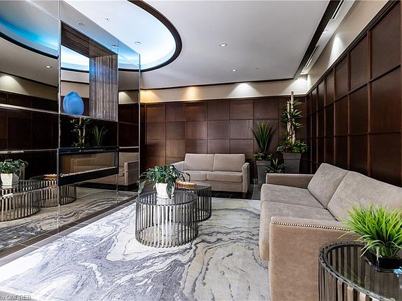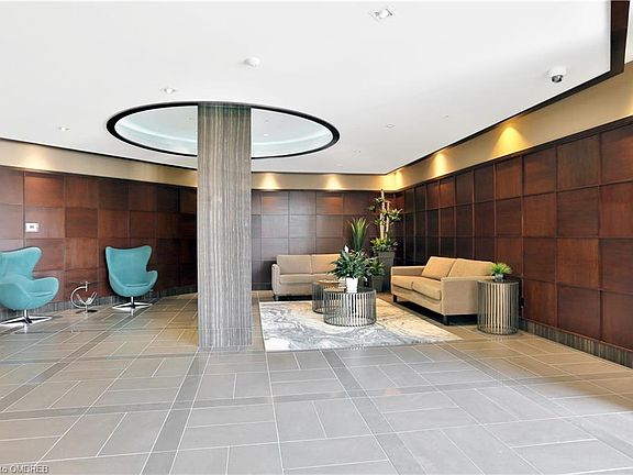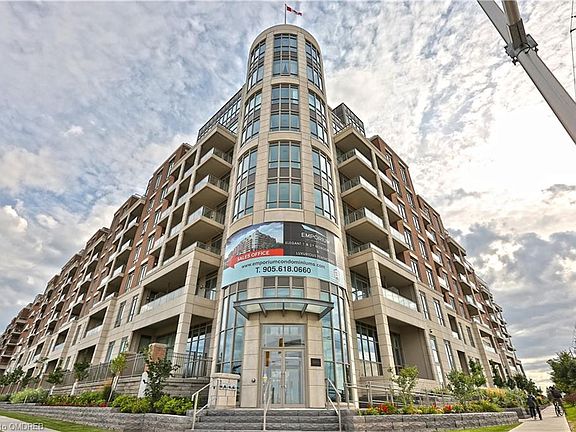 Amazing Value! Begin your resort-inspired lifestyle at the upscale Emporium of Joshua Creek. Across the street from Starbucks, shops, & restaurants & easy access to major highways & GO Train. This sharp one-bedroom + den suite offers approximately 747 sq. ft. of light-filled living space + a private balcony. Convenient two underground parking spaces. If your furry friend is joining you, you will be happy to know that this complex is pet-friendly. This suite boasts fine finishes such as quality wood laminate flooring, 9' ceilings, deep baseboards, custom blinds & 2 walkouts. The spacious living/dining room boasts a tray ceiling, custom blinds & walkout to the balcony with city skyline views. The sizeable den could also be used as a private dining room. A beautiful kitchen with floor-to-ceiling shaker-style cabinetry, under-cabinet lighting highlighting the glass tile backsplash & quartz counters, a large peninsula with breakfast bar & stainless steel appliances, are sure to impress. Your generous bedroom offers a giant closet & walkout to the balcony. The luxurious 4-piece bath features dark cabinetry, quartz counter & a soaker tub/shower combination. You will find the laundry area in the hall area. Residents enjoy extensive building amenities including, an indoor pool, whirlpool, outdoor patio, party room, billiard room & a guest suite is available. Must see!