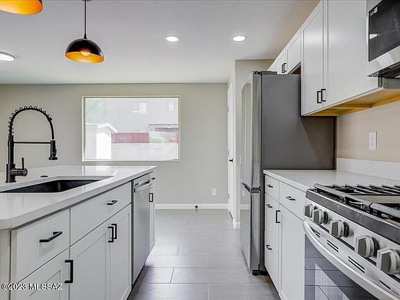 ~$9,000 seller concessions towards buyer's mortgage interest rate buy down or buyer's closing cost with accepted offer~This stunning 3-bedroom gem boasts 1200 sqft of fully remodeled elegance. Step into the open kitchen, adorned with new cabinets and countertops plus a large island. Enjoy the Samsung full appliance package, including a gas range. The master bedroom and rest of the house have a sleek, wood-look tile flooring offering both style and easy maintenancehe entire home has been thoughtfully painted to create a fresh and inviting atmosphere. Experience a new level of illumination with the new lighting fixtures around every corner. The 2 fully remodeled bathrooms feature new vanities and are have beautiful tiling in the shower and bathtub areas, creating spa-like sanctuaries for relaxation.Stay comfortable year-round with the new mini split in the laundry room and the brand-new HVAC system on theroof, ensuring efficient climate control. The roof has been newly coated for added protection, and new windows grace the entire house, combining aesthetics and energy efficiency seamlessly. Outside, find serenity in the gravel-adorned front and back yards, offering low-maintenance landscaping options. With its prime East side location, this home is conveniently situated for exploring all that Tucson has to offer.
