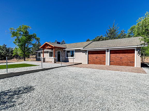 Completely remodeled home on a 1+ acre corner lot in Chino Valley. New HVAC, new roof, new garage doors and more. Almost a brand new home with new stucco and brick exterior. Fresh laid pavers in the front of the home with a covered porch entryway. Enjoy the front yard views all the way to Flagstaff. As you enter the home you will notice the brand new LVP flooring, freshly textured and painted walls, ceilings and doors, a new electric insert fireplace, new lighting throughout and spacious open floor plan. In the kitchen there are new cabinets, appliances, sink and quartz countertops. Don't miss the walk in pantry and very large dining room with gorgeous windows and a slider to the backyard. Good sized bedrooms and a 3/4 bath with new fixtures and tile shower. In the nicely sized master there is a walk in closet, natural light with backyard views and a master bath that includes new vanity, mirror, fixtures and tile surround shower. Detached workshop and plenty of space for pets, animals and all your toys on this flat 1+ acre lot.