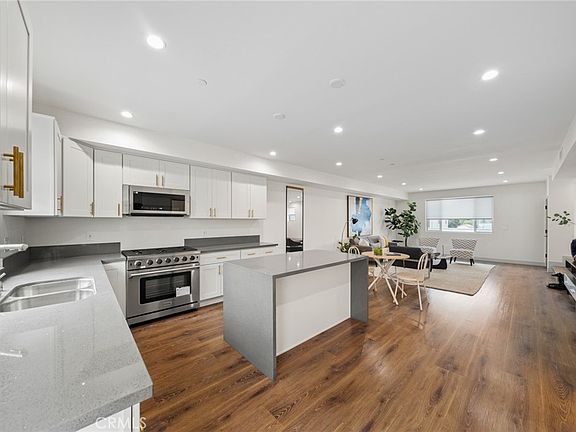 Step into a gourmet kitchen featuring a center island, walk-in pantry, and premium stainless steel appliances, including a dishwasher, 6-burner gas stove, microwave, and refrigerator. The open floor plan seamlessly connects the kitchen to a spacious living/family room, making it perfect for entertaining or relaxing.