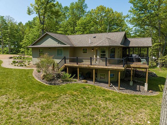 Absolutely gorgeous property located on Hemlock Lake (Red Cedar Chain). Built in 2014 this stunning, 3 bed / 2 bath, 2400 square-foot, open concept home with high end finishes and a brand new 36x43 ft., fully finished/insulated garage checks all the boxes. Boasting of 221 feet of frontage on 3.14 private acres and set perfectly to capture breathtaking lake views, this home offers custom kitchen w/ rustic hickory cabinets, spacious living area, incredible vaulted ceilings, tile shower, hardwood floors, bump out dining area, main level laundry & 2 cozy freestanding fireplaces. Lower level offers a spacious family rm ideal for entertaining guests. Relax in the warm summer breezes while taking in lake views from a screen porch or composite lakeside wraparound deck. Attached to Red Cedar & Balsam Lakes offering miles of recreational fun, great fishing, stunning scenery, boat up golf course, restaurant & pub (live music). Great great area w/ cabin access to ATV & snowmobile trails.
