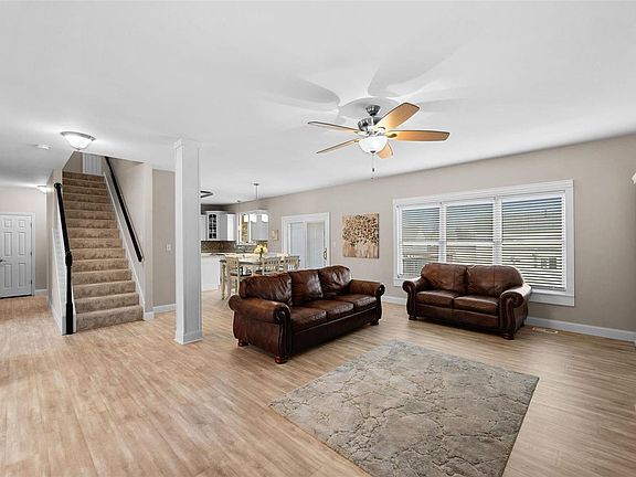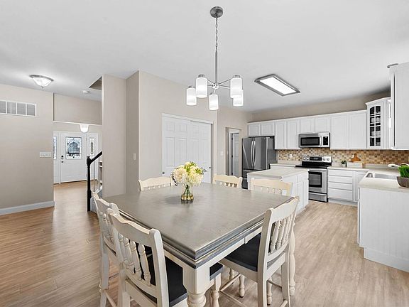 Fabulous 1.5 story home located in Wentzville. Enjoy the cozy front porch & low maintenance vinyl exterior, plus 3 car garage on a level yard. The interior has 9 ft ceilings, decorative front door, newer flooring & neutral decor. The great room has a gas fireplace and bookshelves. The kitchen features white cabinets with crown, smooth top stove, microwave, back splash, center island and pantry plus a breakfast room. The primary suite is on the main floor & has a large walk-in closet, vaulted ceiling and luxury bathroom with dual sinks, soak tub and separate shower. Plus, there is a formal dining room that could be used as an office. There are 3 large bedrooms upstairs, 2 have walk-in closets. The laundry is on the main floor and has cabinets and storage closet. The lower level has a finished flex room great for an office or exercise room plus rough-in plumbing. The backyard is fenced & has a deck. The garage is 33 x 20, the 3rd car space is to the right of garage door. Roof 2024