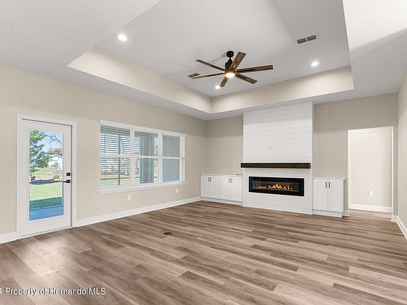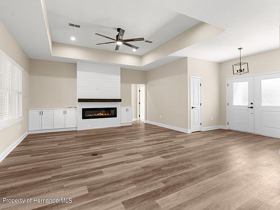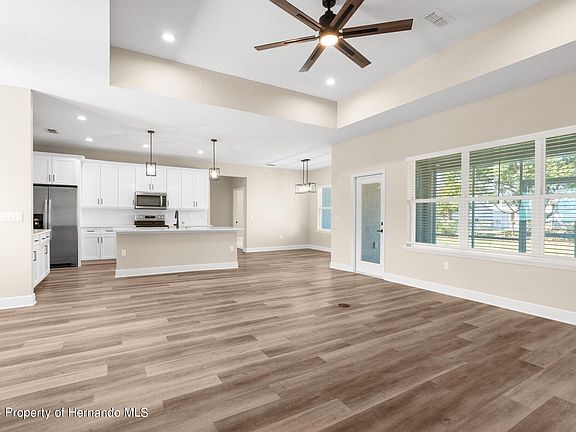ACTIVE UNDER CONTRACT-ACCEPTING BACKUPS! This beautiful home is the perfect blend of comfort and elegance. The combination of modern amenities and thoughtful design details make it a true sanctuary for its residents. From the spacious living room with its tray ceilings and custom-built cabinets to the gourmet kitchen with Quartz counters, enormous walk-in pantry and stainless-steel appliances, every aspect of this house exudes luxury. The master suite is a haven unto itself, with a walk-in closet that can accommodate even the most extensive wardrobe, a separate shower, and a luxurious soaking tub where you can relax and rejuvenate after a long day. The two additional bedrooms are generously sized and share a beautifully appointed guest bath with dual sinks and ample storage. Located in the vibrant community of Spring Hill, this home offers convenience and access to a variety of amenities, including shopping, dining, entertainment, and outdoor activities like the Weeki Wachee river. Whether you're looking to host gatherings with loved ones or simply enjoy a quiet evening at home, this house provides the perfect setting for all your lifestyle needs. Don't miss the opportunity to experience the charm and comfort of this remarkable property. Uploaded stock photos and video of this floor plan. Actual home may differ from photos. All new furniture and Washer/Dryer in the house are available for purchase, separately.