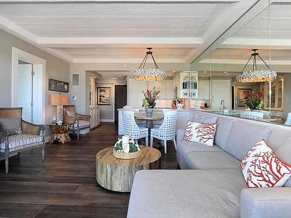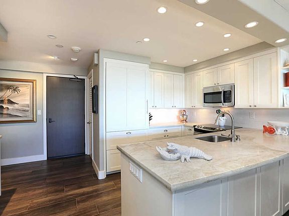 Whaler 757 was remodeled in 2019 and has never been in a vacation rental program with the current owner. Amazing Italian quartz counter tops and Italian tile wood flooring, custom made cabinets with soft pull drawers, Sub-Zero refrigeration, Bosch dishwasher, Bosch stack W/D and GE Profile appliances give a luxurious feel. The dining area is accented with a creative oyster shell chandelier, the easy use Hunter Douglas blinds throughout are also a custom fit. The entry area is emphasized with a harmonious china cabinet to display all your valued treasures. Both bathrooms feature fabulous tiled walk in showers and the guest bath a delightful ocean décor. Relax and enjoy your favorite beverage on the spacious lanai while soaking in views of the majestic blue Pacific and the island of Lanai. Amenities include an ocean side pool, day spa, sauna, gym, salon, underground parking, tennis courts, BBQs, business hub center, on-site concierge services, and beach activity kiosk. Tropical landscaping and Koi fish pond make the inner courtyard a tranquil setting. The furnishings are negotiable and will be sold thru a bill of sale at the close of escrow.