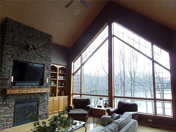 Welcome to your private retreat! This beautiful first floor master on 3.83 acres has gorgeous lake views. Serenity surrounds this home sitting on top of the hill side at the end of the cul-de-sac over looking private lake, secluded woods, Tuscarawas River dam and waterfall you can hear from the screened in back porch or deck. Superior quality throughout and amazing lake views from the kitchen, great room and master bedroom. Gourmet kitchen with maple cabinets, granite counter tops, large island, walk-in pantry, stainless steel appliances and hickory hardwood floors. Vaulted great room with wall of windows, floor to ceiling stone fireplace, hickory floors and custom wood ceiling treatment. First floor owner's suite with his and her closets, and deluxe bath with two sinks, 6 foot bubble tub and tiled shower with six shower sprays. First floor laundry room with built in cabinets and lockers. Finished walkout lower level with rec room with bar, office and bonus room currently used as a conference room. Separate stairway from garage to lower level. Attached three car garage and detached four car garage. Private lake access, large backyard, deck, screen back porch and fire pit are all perfect for entertaining or relaxing! Call today!