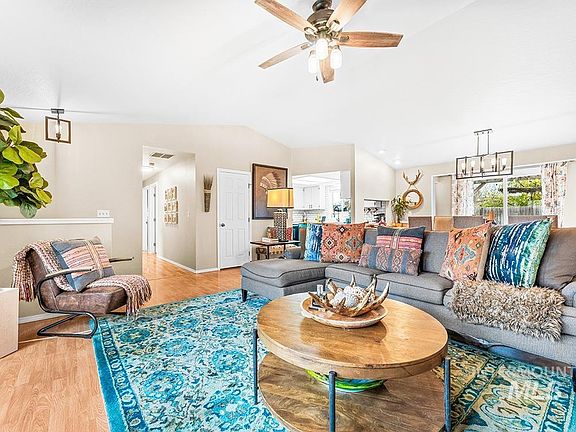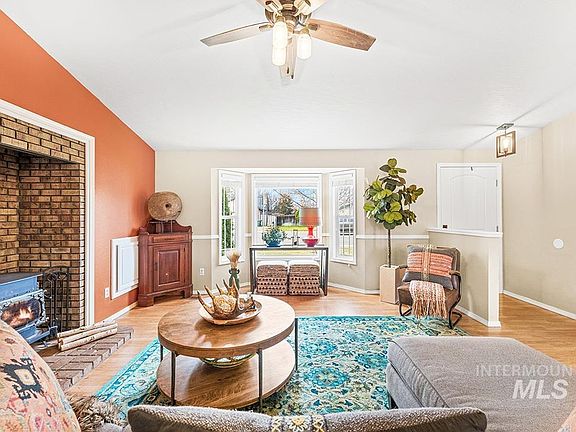 A lovely, open floor plan home on a sprawling corner lot with thoughtful touches and updates throughout! With RV parking, fenced yard, and nearby Chateau Park, this home offers many perks that go beyond its four walls. The well-maintained exterior features brick detail, wooden window boxes and shutters, and colorful berry trees. Step into the open living area, centered around a wood-burning stove with brick hearth and surround, adding charm and warmth to the room all year round. Stylish, transitional lighting fixtures hang from a tall, vaulted ceiling, and a breakfast bar connects the kitchen to this livable great room. Green painted lower cabinetry with new butcher block countertops make the kitchen a welcoming space to prepare a home-cooked meal - the kitchen window overlooks the fantastic backyard, perfect for pets or little ones to explore. A main-level primary bedroom with attached full bath features new tile in the walk-in shower.
