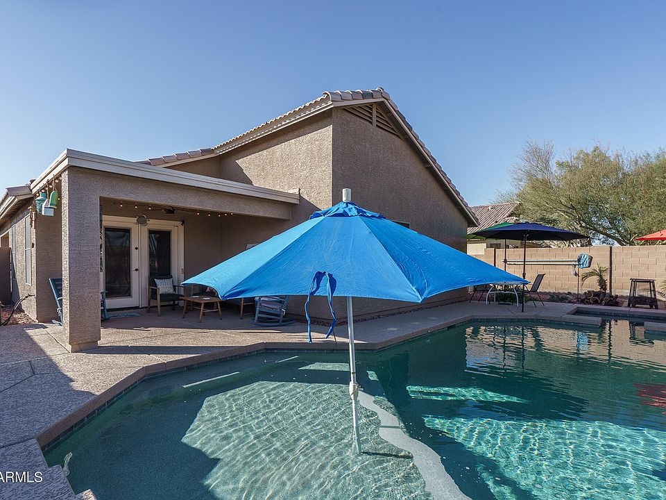 Recently remodeled 3 bedrooms +Den, 2 bathrooms. You will love the resort style backyard with a heated waterfall pool and spa! new water heater, New AC unit! the home has neutral tones, vaulted ceilings, wood-look tile. The kitchen is gorgeous with updated stainless steel appliances, staggered cabinetry, tile backsplash that goes to the ceiling. Great room is prewired for surround sound! covered patio with a ceiling fan to keep you cool. The primary suite is spacious with vaulted ceilings and an updated ensuite with a walk-in closet, and a tiled shower. Do not miss out on this home! Easy access to shopping, Dining and entertainment