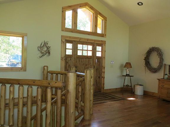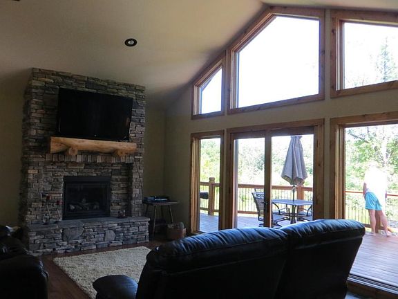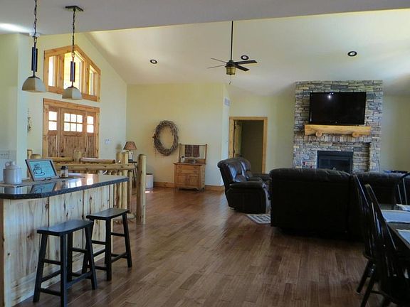 SECLUDED SETTING! Enjoy the warm rustic feel of this custom built maintenance free one of a kind like new ranch home. Kitchen offers hickory cabinets, all appliances, island w/bar w/ dining area, lr w/fl & main level laundry. Master bdrm w/master bath & walk-in closet, log staircase to the walk-out bsmt w/fr, 2 bdrm & bath. 60 ft deck overlooks stocked lake. Energy efficient geothermal system.