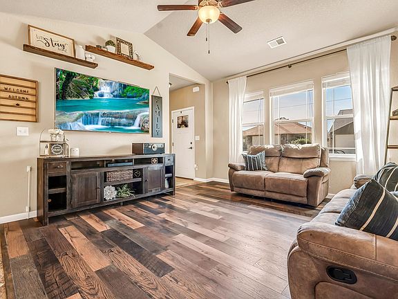 Enjoy Heritage Estate's newest listing on a coveted corner lot with RV parking, just down the road from Canyon View Park, dining, entertainment, and multiple schools. No detail has gone unnoticed in this charming, ranch style home featuring an open concept floor-plan, 9 ft. vaulted ceilings with a cathedral ceiling in the living room, custom faux wood blinds, extensive walk-in pantry, and newly installed laminate flooring & ceramic tile throughout the home. Indulge in the sizable master suite with an enormous walk-in closet, and 5-piece master bath ensuite, in addition to two spacious bedrooms, each accompanied by a walk-in closet. Step outside to enjoy your morning coffee on the extended covered patio, and fully landscaped yard with drip systems, timed sprinklers, and garden area for that green thumb. The finished garage is equipped to store all your toys with a pull down ladder for attic storage and epoxy flooring. This is truly a turn-key home that is priced to sell, just awaiting its new owner!