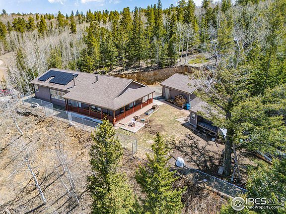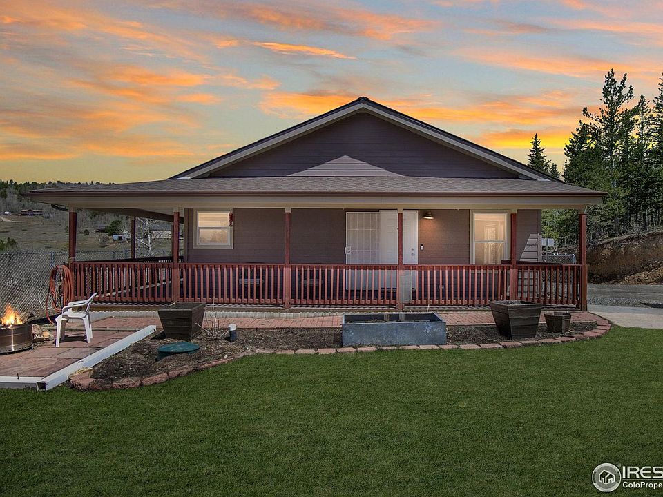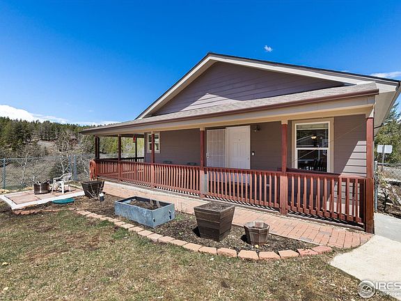 Experience the recreational appeal of living in Gilpin County in this ranch style home built in 2004 that has been meticulously maintained & improved. Nestled at 9000' with an easy commute on all maintained roads, this usable 2.4 acres enjoys magnificent views of mountains, valleys & the snow-capped Continental Divide. Off-set your energy bills with the owned & newly installed 5.6 KW PV solar system (2023) that helps to secure lower energy costs & a new class IV roof in 2019. Enter through the over-sized, wraparound covered front porch into this sprawling ranch with low-maintenance laminate floors, 9' ceilings and bright, airy spaces. The large country-style kitchen features an island w/ an ample amount of storage & counter space, a pantry & bar-seating that connects to a large dining room for convenient entertaining. The spacious living room has newer carpet, plus a woodstove that creates a warm & cozy atmosphere. This functional layout offers 3 generous-sized bedrooms & 2 full bathrooms with plenty of living space to comfortably spread out. The primary suite has a walk-in closet, a 5-piece luxury bath & an electric fireplace adding heat & ambiance to your private sanctuary. Outside find a flat, fenced yard w/ a small outbuilding previously used as a chicken coop but could be modified to suit many different purposes. Sit on the flagstone patio where you can enjoy the incredible views or the long summer evenings around a fire. The over-sized 576 SF garage is insulated w/ overhead storage, plus an included 40' shipping container that provides an abundance of storage options. An ideal location only 3 miles to Black Hawk/Central City, 18 miles to ski Eldora or about 30 minutes to Golden, Denver and nearby metro areas. The Gilpin County Community Center is just around the corner w/ classes, a gym, indoor running track, basketball court, 2 pools & more! Embrace the mountain lifestyle defined in this peaceful location with incredible convenience.