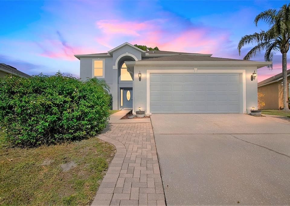 LOCATION, LOCATION, LOCATION! Welcome to this 4 bedroom/2.5-bathroom, PLUS flex room, 2-car garage with a NEW ROOF home situated on a LARGE CONSERVATION LOT in the well-maintained community of Enclave. Mature landscaping greets you as you pull into your driveway to palm trees, shrubs, and beautifully paved walkways leading you to the front door, a walk to the side garage door, or backyard. As you enter the home, you’ll immediately notice the light and airy feel due to the abundance of natural light, light interior paint, wide white baseboards, and light tile flooring throughout the first floor. To the left you’ll find the formal dining room with window view looking out onto the front exterior lawn. Just past the formal dining room you’ll find the open concept, bright and light kitchen featuring white cabinets, quartz countertops, light blue subway tile backsplash, island, stainless steel appliances, and double pantry closets. Situated next to the kitchen is the family room with a large window providing ample light and views to gaze out at the mature and beautiful trees. Additionally, on the first floor (right side) you’ll find a half bath, laundry room, and spacious flex room, which can be used as a 5th bedroom, den/study, or child’s playroom. As we head upstairs the carpeted stairs and second floor, you’ll find the SPACIOUS primary bedroom with two walk-in closets, ensuite, including garden tub, and separate shower. Three guest bedrooms are all located on the second floor and enjoy central access to the full guest bathroom. Ceiling fans are located throughout the home. Access your large backyard and storage shed via the kitchen slider. Enjoy peaceful conservation views while grilling, gardening, letting your fur babies run around, or playing fun family games to name a few, and with plenty of space to add a pool. Conveniently located near I-75, The Shoppes at Wiregrass (8 mins), Tampa Premium Outlets (5 mins), The Grove at Wesley Chapel (Krate) (9 mins), restaurants, retail therapy, grocery stores, and much more! Schedule your showing today!