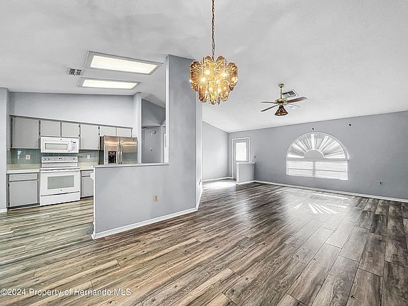 FRESH EXTERIOR PAINT!! NO CARPET! LARGE, SHADED BACK YARD! 3 Bedrooms, 2 full bathroom, 2 car garage with workbench bump-out and a fenced in back yard is located near the heart of Spring Hill. Just 3.7 miles to Tampa General Hospital's Spring Hill campus, 45 minutes to Tampa International Airport, and minutes from shopping. This house was just professionally cleaned and is ready to move-in. Laminate flooring throughout the house, linoleum in the tiled bathrooms and the large indoor laundry room. Master bedroom has a 6x6 foot walk-in closet and a walk-in shower. The 2nd and 3rd bedrooms provide room for family, guests or a home office. The massive lanai overlooks an expansive shaded back yard, perfect for a barbecue or the furry friends to run about. This could be your next home or your forever home with a little TLC. Schedule your tour today!