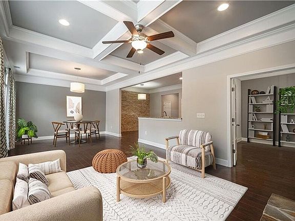 Step inside and be greeted by a modern kitchen equipped with top-of-the-line appliances, stone wall accented dining area, hardwood floors, coffered ceilings, stone fireplace, and french door leading to a bonus/office/play room. The open layout flows seamlessly into the living areas, perfect for gatherings or cozy nights in.