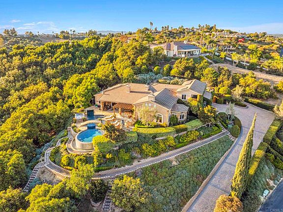 Nestled on 3.61 acres, this stunning 5,000 sq ft estate epitomizes luxury and tranquility. Featuring three lavish bedrooms and 3.5 bathrooms, this home offers an unparalleled lifestyle of elegance. The executive office provides a refined workspace, while the grand wine cellar, adorned with European cobblestone, is a haven for connoisseurs. Upon arrival, be captivated by a cascading waterfall and serene Koi pond that enhance this luxurious home. The grand entryway leads to an inviting foyer and an expansive primary suite with a cozy fireplace, floor-to-ceiling glass doors to the lush backyard, and a spa-like ensuite with a steam shower, soaking tub, and bespoke tile finishes. Thoughtful walk-in closets provide generous storage and sophistication. The upper level features a captivating billiards room and a third opulent bedroom with an ensuite bath and private balcony. A 2nd bedroom on the main level also includes an ensuite bath and spacious walk-in closet. Culinary enthusiasts will be emersed in the chef's kitchen, equipped with high-end appliances and custom finishes, flowing into the family room and outdoor living area. Enjoy al fresco dining by the heated infinity-edge pool, complete with a Baja shelf, in-pool bar stools, and a spa with a view. This outdoor paradise includes a shower, fully equipped bar, charming fireplace, and a newly crafted pergola—perfect for entertaining. Surrounded by avocado and fruit trees, nourished by a private well, this estate embodies beauty and eco-friendliness, enhanced by seller owned solar panels and advanced irrigation. The barn is mostly used for storage and ag work. It has a separate full bath. Experience upscale living in the gated community of Champagne Crest, where every detail reflects meticulous craftsmanship. Seize this rare opportunity to claim your luxurious sanctuary.