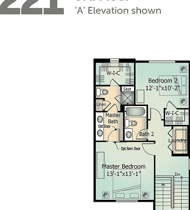 Ready in April. The 221A is a 3-story urban style home with 2 car garage in our Midtown Collection at Hannah Ridge. 2+ bedroom, 2.5 bath home. Kitchen features designer cabinets in mineral finish, granite counters and stainless appliances. Air conditioning. Insulated garage. Garage service door. Straight iron pickets at stairs. Gas line to range. Front deck off living room. Lowest level flex room can easily be used as 3rd bedroom. Landscaping included.