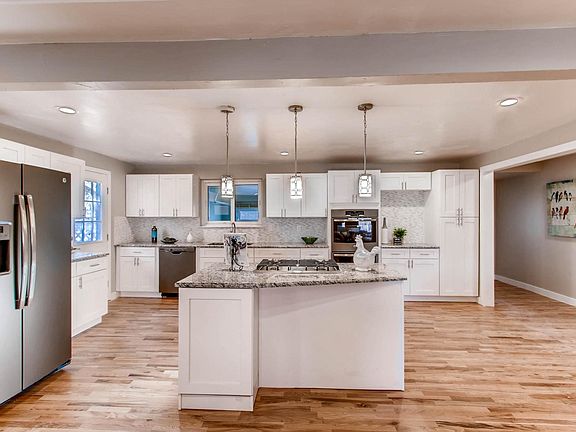 New windows, new hardwood flooring, and a spacious, open concept living space. Kitchen features all new cabinetry with soft close doors, slab granite counters, backsplash, and Slate appliances. Oversized attached 2 car garage and additional driveway for all the toys. Just minutes from downtown Edgewater and Sloans Lake