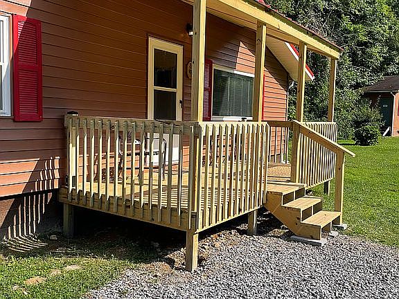 Home has been completely redone from the ground up, cathedral ceilings ,front porch , large yard. Private setting, bear sightings regularly.