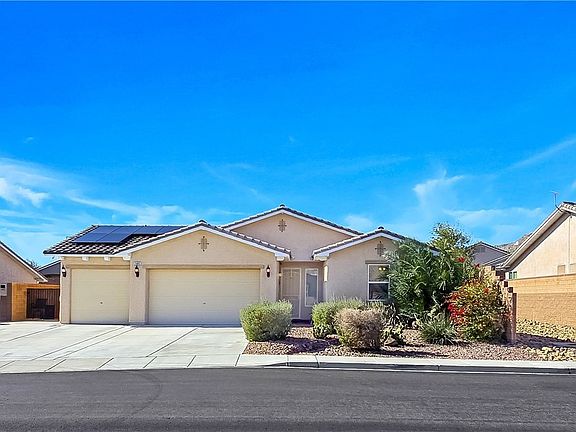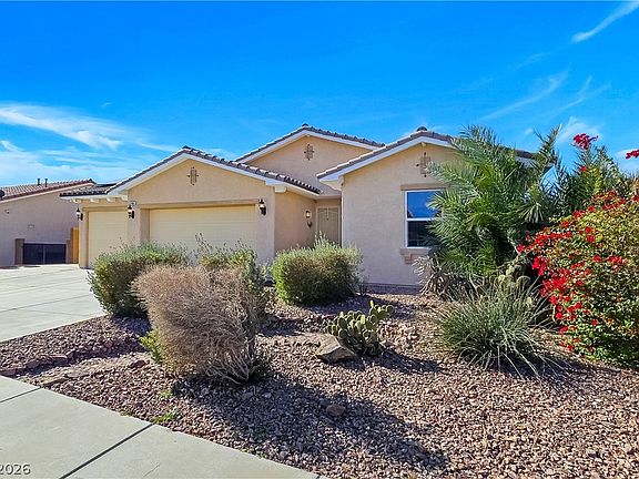 Truly unique semi-custom single story home with RV parking in Bilbray Ranch in Laughlin! As you enter the home, you are greeted with a dramatic entry with an open floor plan. Chef's kitchen is a masterpiece boasting custom cabinets, granite counters, breakfast bar, dining area, white appliances overlooking the living room great for entertaining. Laundry room with cabinets. 3 bedrooms and 2 bathrooms. The primary bedroom is showcasing the primary bath with a huge walk-in closet, soaking tub, shower and double sinks. Oversized 3 car garage. Resort style backyard oasis with a pool, covered patio w/shades, trees! The whole backyard is completely fenced with privacy fencing. SOLAR PANELS PAID IN FULL!!!