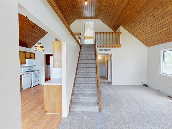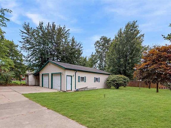 Mechanics garage you've dreamed about!! 4+ cars or your business equipment, heated and cooled with tall overhead doors! Freshly painted and new carpet throughout with hardwood laminate floor in kitchen. Your kitchen is bright and cheerful with ample cabinet and counter space and a large eating area. All appliances are included in the sale. Knotty pine cathedral ceilings. Two downstairs bedrooms, one upstairs with landing for extra space, as well as balcony off master bedroom with 1/2 bath and walk-in closet. This is a great opportunity for a good home with a large outbuilding. Don't wait, schedule your showing today!