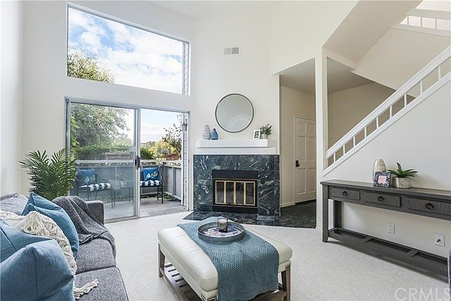Don't miss this gem! Welcome Home to your charming condo. With so many delightful touches, such as fresh paint, new carpet, some upgraded light fixtures, and all new electrical outlets and switches, coming home will be a pleasure. As you enter the front door, the marble-tiled entry leads to a living room with walk-out patio and marble-framed fireplace. Natural light comes through most of the windows. Up a short flight of stairs you will find the dining room loft overlooking the living room with a coat closet, a vintage kitchen with range, microwave, refrigerator and dishwasher and freshly painted cabinets, an extra room that could be your office with garden box window, and a laundry room with hookups for washer and dryer. Up another flight of stairs and you pass under the new chandelier and look out the tall window with an expansive view of the nature and greenbelt area. The Master Suite has a flagstone-hearth fireplace, bathtub/shower combo, double sinks, and a walk-in closet. The Guest Suite has a spacious closet and a bathroom with vanity lights and bathtub/shower combo. Coming home is easy with a 2-car attached garage, and there are cabinets galore for ample storage space, which is a real commodity in Southern California. You are just steps away from trails and a community pool with spa, and just a ten-minute drive from beautiful Laguna Beach towards the west, and three major freeways to the east. There is no Mello-Roos.