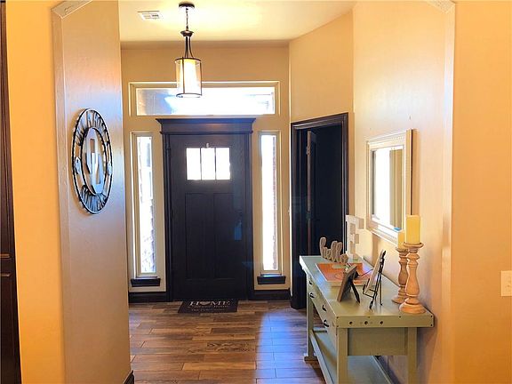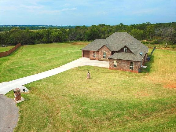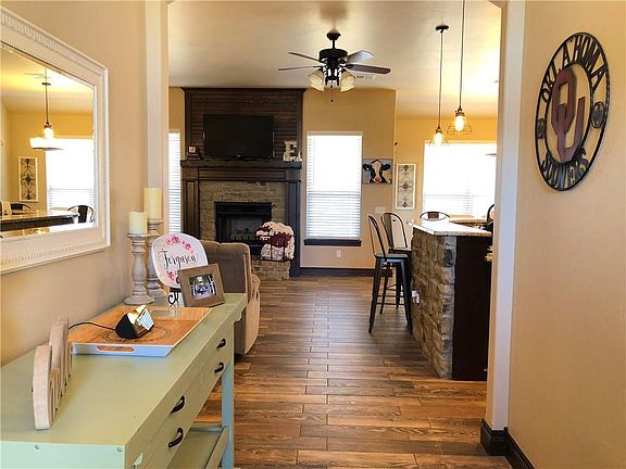 A little slice of heaven on 1.48 acres! The "L" shaped drive boasts a split 3 car attached garage and leads to covered front porch with charming exterior lighting. Entryway leads to open floor plan with living room flowing seamlessly into kitchen and dining. Stunning faux wood tile floors below and fabulous light fixtures above set the tone for this beauty. Kitchen offers wrap around breakfast bar with gorgeous stone façade, granite counter tops, and pendent lights, in addition to the single-basin farmhouse sink, beautifully stained cabinetry, and walk in pantry. The living room is not to be outdone when it comes to beauty with a stunning mason, gas log fireplace with wood mantle. Master bedroom features tray ceiling with ceiling fan and incredible master bath with sliding barn style door, soaking tub, separate tile surround shower, and double vanity. Jack 'n' Jill bath connected to secondary bedrooms. New above ground storm shelter in garage. Covered patio in back. Refrigerator stays.
