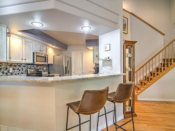 Fantastic updated townhome in the desirable Chateaux at Aurora Park community; terrific location in the back of the complex! Open and airy floorplan featuring a vaulted living room w/gas fireplace, open dining & an updated kitchen w/granite slab counters, backsplash, breakfast bar, antique white cabinets, SS appliances & a walk-in pantry. Convenient main level bedroom, currently used as a family room, plus full bath. The upper level boasts a loft w/skylight plus a spacious vaulted master bedroom w/his & hers closets & remodeled master bath w/recycled glass surface counters & antique white cabinets. Finished basement w/large bedroom (or rec room) plus 3/4 bath. French doors lead to a trex deck w/a retractable awning & gas line for grilling. Quiet and close to everything--shopping, dining & light rail--with amazing highway access! Wonderful community in the highly coveted Cherry Creek School District!