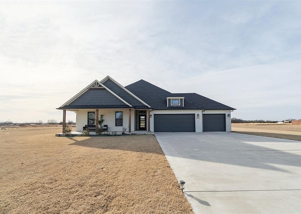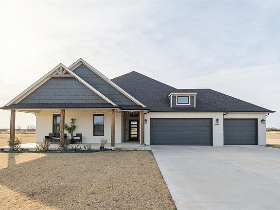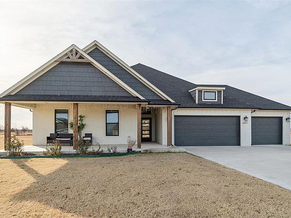 Located in the desirable Vista Bonita Addition of Purcell, this beautifully crafted modern farmhouse sits on a spacious one-acre lot. The open-concept floor plan features vaulted ceilings, abundant natural light, and a welcoming living area ideal for both everyday living and entertaining. The chef-inspired kitchen is a true centerpiece, offering an oversized island with seating, gas cooktop, generous cabinetry, and a large walk-in pantry designed for maximum storage and functionality. The primary suite provides a private retreat with a spa-like en suite featuring a double vanity, walk-in shower, and a large walk-in closet with built-ins. Additional highlights include well-appointed secondary bedrooms, a built-in desk area, a functional utility room with ample storage, and an oversized three-car garage with storm shelter and room for vehicles, hobbies, or equipment. Outside, enjoy peaceful country views from the covered back patio and expansive yard, perfect for outdoor living, gardening, or relaxation. Built with modern finishes and timeless style, this home offers the ideal balance of luxury, comfort, and rural charm while remaining just minutes from Purcell amenities, schools, and major highways.