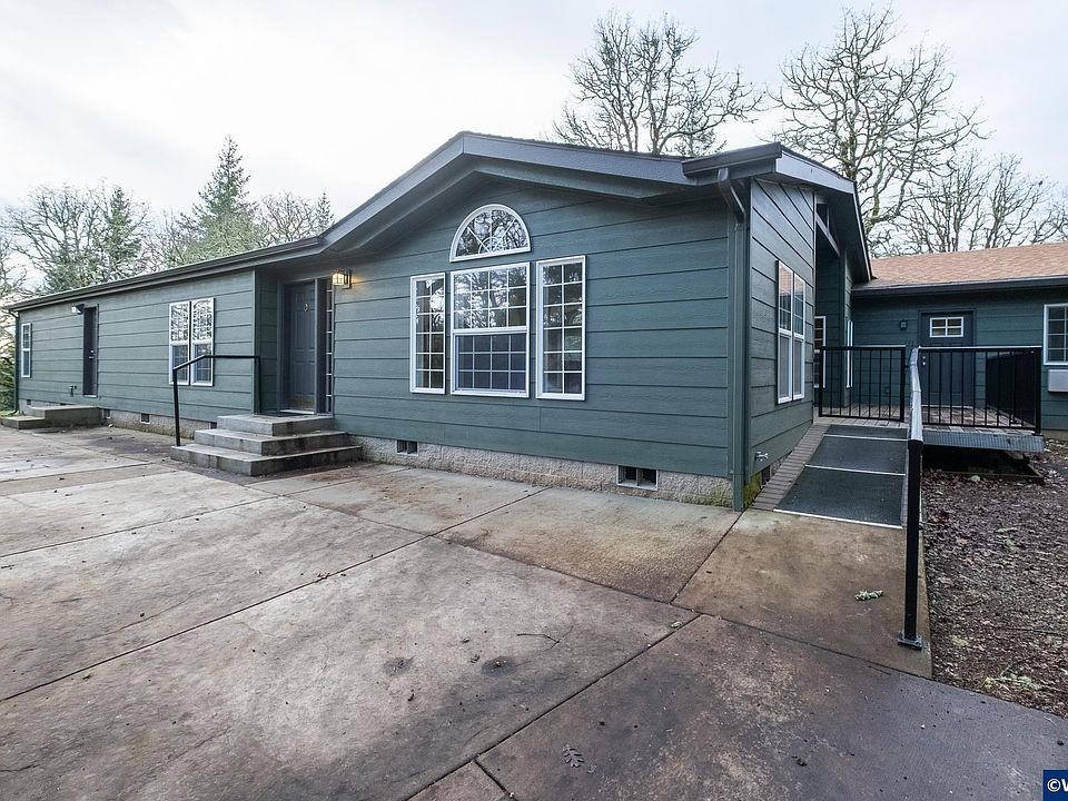 Great single level triple wide with elegant cathedral vaults. Origami ceilings with large half-round windows with lots on natural light. Natural oak cabinetry with back splash. Gorgeous views which you see for miles with this hill top home on 40 acres, and some timber. Nice floor plan with garden bath with brand new custom shower in suite. ADU is attached with large vaulted ceilings and open floor plan. Deck and patio, plus large detached shop with lien to. Privacy established oak & fir tree's!