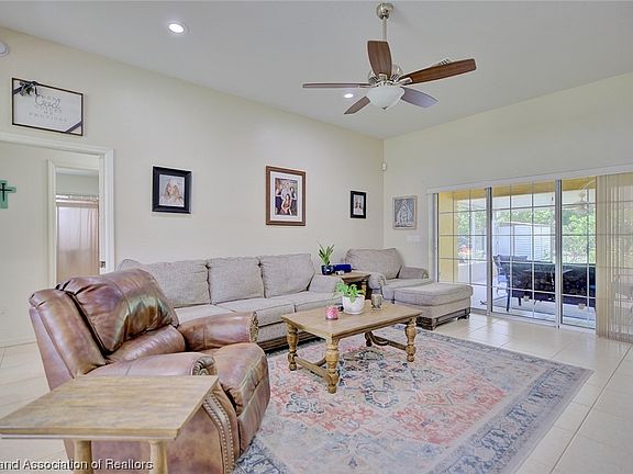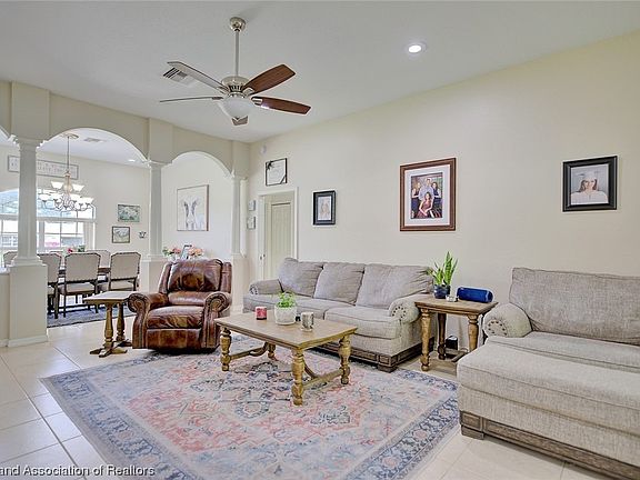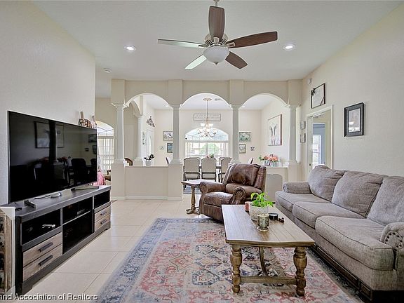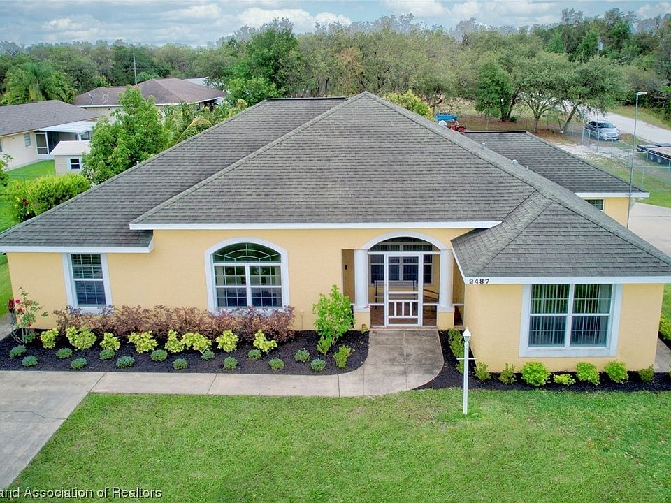 Welcome Home! Lovely 3-bedroom 2.5 bath home on 5 lots totaling just about 1/2 acre of land on a corner lot. This move in ready home offers lots of space to accommodate a large family with a split bedroom plan offering the spacious master suite with wood laminate, lighted ceiling fan and on suite bathroom with a nice big walk-in shower. Main living areas have large tile and high ceilings including the kitchen and breakfast nook. The kitchen has top of the line stainless whirlpool appliances that are 1.5 years old, many cabinets and drawers for all your cooking and storage needs including small prep island with storage. Living room has nice arched columns that lead to the formal dining area that will sit many guests for entertaining. 2 guest bedrooms and a bonus room share the guest bathroom. 21 x 25 lanai has plenty of room for your next party. 2 car garage with a 1/2 bath and a 1 car carport. 2 concrete driveways with one in the front and a long driveway to the garage and carport. The huge lust green lawn has a 5-foot fence for the dogs and small shed for storage. beautiful landscaping in the front and back yards. Septic tank was pumped in Feb. 2023. Irrigation was all replaced in 2022 and security system with cameras are included in the purchase.