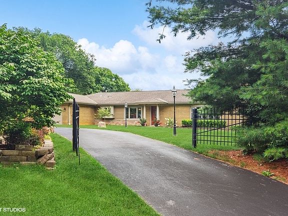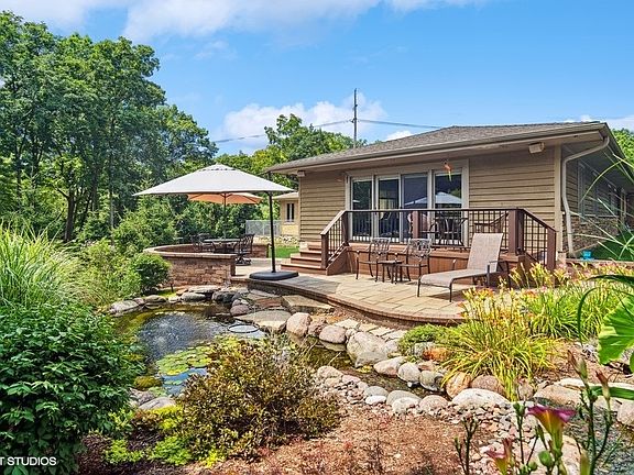 Impeccably maintained ranch home tucked back on over an acre, this brick home offers main floor living with lush professionally landscaped fenced yard, and a convenient location. The brightly lit expansive kitchen offers custom Amish cabinets, Wolf gas cooktop with commercial grade vent hood, double ovens, warming drawer, spacious island and great breakfast room. There's a spacious formal living room with a bow window, and a wood burning fireplace. Main floor primary bedroom is adjacent to a newly remodeled bath - easily converted to an ensuite. There are three more bedrooms, all with hardwood floors, and another fully updated large bath, plus a large laundry room. A nearly 1000 square foot great room is the heart of the home with a wet bar, game and media areas and French doors opening to a composite deck and stone patio overlooking the inspiring koi pond and park-like setting. There's also a dog run, and huge yard for soccer, fruit trees, gardens, and entertaining. There's a two car attached garage, a newer two and a half car heated detached garage, and a newer driveway with plenty of room for parties and parking. Seller is only the second owner and has lovingly and immaculately maintained the home with newer kitchen, baths, roof, windows, HVAC, well, driveway, deck, koi pond, water garden and patio. This move-in ready home is privately tucked off of main road and is a 'must see'.