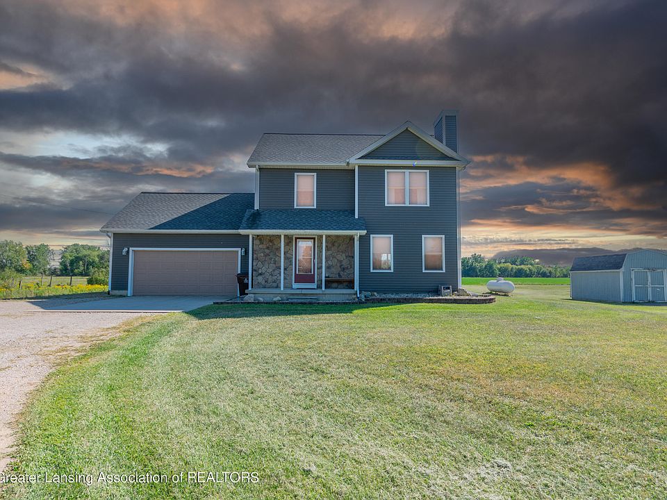 Welcome to the Farmhouse! This stunning home has been meticulously updated from top to bottom and feels like a brand new construction home. Set on a secluded 1.5 acre parcel, you can enjoy views of farms and spectacular sunsets, but with FIBER INTERNET available! Enter the home from a covered front porch to an entryway with vinyl plank flooring. To the right is the living room with gorgeous custom bookshelves, a ship-lap fireplace with a barnwood mantel and wonderful natural light. The formal dining room has intricate wainscotting and the entire home has brand new trim, making it feel like a modern farmhouse from a magazine. The kitchen has been completely renovated as well with white cabinets, butcher block countertops, a stainless steel farmhouse sink, and all newer stainless steel appliances. Open wood shelving in the kitchen gives the space an elegant and streamlined feel. There is also a HUGE pantry and open space that could double as a mud room area. The half bath ties into the features of the rest of the house with wainscotting and a newer vanity. Brand new carpeting on the stairway connects to the upstairs where you will find two totally renovated bathrooms with beautiful sliding barn doors, newer flooring, and newer vanities. The primary suite includes vaulted ceilings, a private bathroom, and large closet. You will also love the convenience of second floor laundry (washer and dryer stay!) There is room to expand in the basement, which already has an egress window and excellent storage. The privacy of the yard is absolute and you can enjoy it all from the large backyard deck or the firepit. Other features include central air, two sheds, a large attached garage, driveway with a turn around, and did we mention the FIBER internet!?
