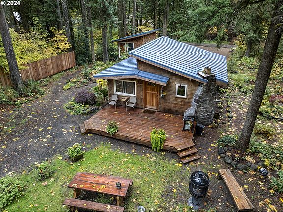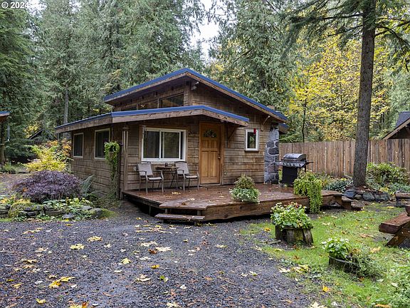 Located at the end of a quiet, dead-end street, this cozy one-bedroom, one-bathroom cabin is an ideal weekend retreat or full-time sanctuary for those seeking peace and inspiration. Surrounded by trees, the property offers a private wooded setting. The large front porch overlooks a well-landscaped yard that blends seamlessly with the forest. Entering the cabin, you are welcomed into an inviting kitchen and living room open floor plan with vaulted ceilings. Addition studio inspires creativity with its own space to work on projects. Parking is available both in front and behind the cabin, accessibility is never an issue, yet privacy remains intact. A short trail leads to river access, where you can enjoy the soothing sounds of water. Less than 15 minutes to Ski Bowl, 20 minutes to Timberline Lodge, and an hour to PDX!