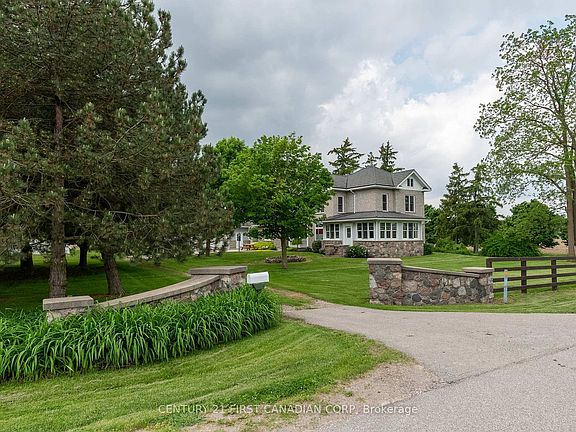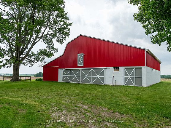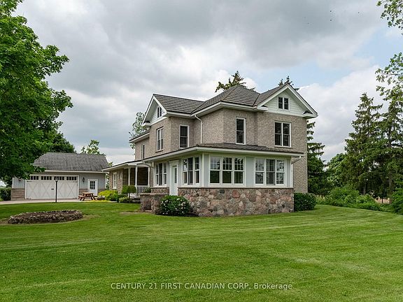 99.75 Acres near Poplar Hill, between Strathroy and London, Ontario. Welcome to 24885 Poplar Hill Rd: A Stunning Country Retreat with huge house, garage and driveshed/workshop PLUS a 1/2 acre parcel (separate ownership). This is the one you've been waiting for a rare country property that doesn't come up every day. This picturesque farm features 88.5 workable acres (systematically tiled in 2021) of Perth Silty Clay Loam soil and 8 acres of lush bush with room for a cabin, long walks or firewood. This property is located on a paved road and nestled within rolling acreage. The property includes a large, beautifully restored brick and stone century home with 4 bedrooms and 3 bathrooms, featuring exquisite trim work throughout, a 50- year steel roof, geothermal furnace, a 200 amp panel, newer windows, copper wiring and plumbing, updated insulation, and 9-foot ceilings. Fresh flooring and paint adorn the home, originally built in 1910, which now boasts drywall construction. Additional highlights include a spacious veranda with Anderson windows and heated floors. The property also features a detached garage (28'3" x 21'11") with insulated doors and walls, and an additional large driveshed/workshop (56' x 49'10"). This unique farm is perfect for agricultural pursuits (A1 Zoning), a potential horse farm or a great investment or addition to your current land base; offering serene beauty and unparalleled charm. Don't miss your chance to own this rare gem schedule a private tour of 24885 Poplar Hill Rd today!