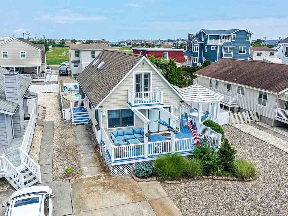 CONTEMPORARY TWO STORY HOME WITH DRAMATIC VAULTED CEILINGS, PLENTY OF DECKS AND AN INGROUND POOL. The traditional floor plan has an interesting architectural design allowing four bedrooms and two baths. The orientation of the main living space is towards the rear yard overlooking the inground pool allowing a calming sense of privacy. The side entry takes you into the vaulted great room that is filled with natural sunlight. The living room is spacious, has bay windows and builtins; dining area has a vaulted octagon ceiling and is immediately adjacent to the large kitchen with entertaining peninsula. First floor has three bedrooms, hall bath and master bath. A custom spiral staircase takes you to a large second floor loft/ rec room and a vaulted fourth bedroom with Joliet balcony. There is a fabulous wrap around, southern exposed sun deck with access to exterior storage on the front and side of the home. There is plenty of pool decking in the rear yard as well as a nice outside shower. Other features include a vinyl shake exterior, central air, beverage fridge for the dining area, stainless steel appliances and underground utilities. Home sold furnished less personal items.