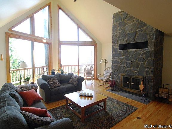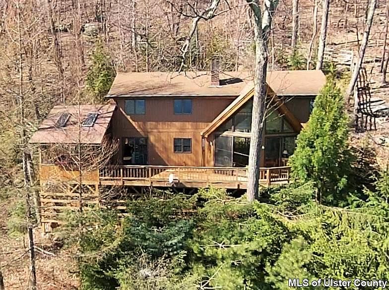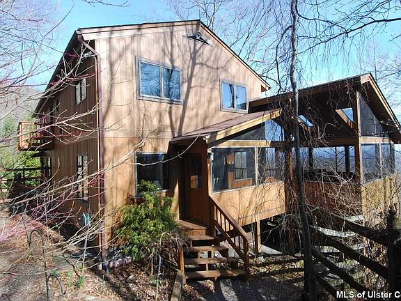 For those looking for something remarkable, this great south facing and private home offers outstanding mountain, reservoir, and the valley views. Mohonk tower is clearly visible in the distance. This strong, well built and beautiful home features the windows, decking, landscape, and porches, to fully take advantage of this privileged setting. With four private acres, you will feel as though you have much more at this mountain side home. The home itself has a terrific layout where the huge living room and dining area enjoy floor to ceiling stone fireplace and wall of windows. Go into the kitchen area from there to find another dining area, and hangout, family room space too. This area leads to the screened hall with door to backyard, and on the other side, door to the gorgeous screened porch. Huge deck attached to this area to span the entire front of the home, and the view is there to see from every angle. Upstairs find the special master bedroom suite with pocket glass doors overlooking the living room,; private bathroom, and private balcony too, making this area obviously the proper space for the master of the house. On the other side of the landing on this level you will find two guest bedrooms and full bath. The lower level has a great workshop room, office, and two car garage. Great systems, central A/C, the home has a very practical use of space with laundry room in the lower level, front door vestibule, for taking off boots, front hall powder room too... plenty of closets throughout and all this makes the home perfect for full time or part time use. The back yard has had carefully created steps going up into a very special garden created by the current owner, with many interesting and unusual trees... and this garden area has a full irrigation system, and is fully fenced. In front there is a lower level area for fun... and this property would be endless hours of exploration for kids. A quick ride down the hill to the village of Woodstock, this home is for an adventurous buyer who craves a bit of drama. Top of the world Ma! Come take a look!