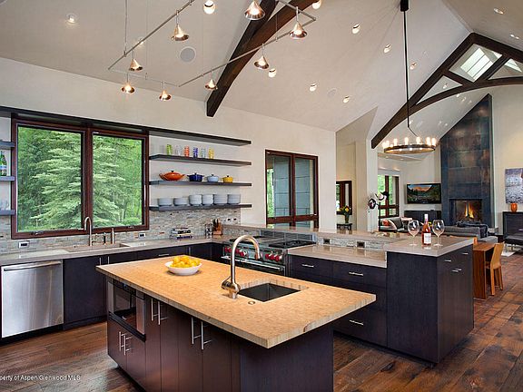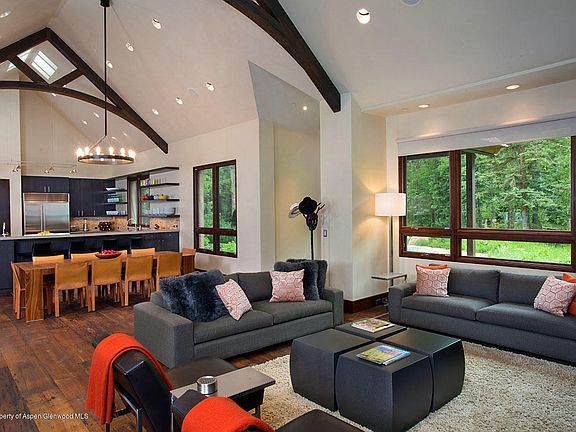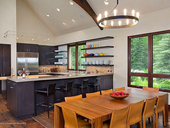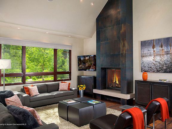 Nestled among the aspens and evergreens along Castle Creek, this remarkable contemporary retreat is only minutes from the vibrancy of Aspen, yet feels a world away. This extraordinary home is cleverly designed for reconnecting with family and friends—and nature. Gathering places and private spaces are seamlessly linked to the natural surroundings. The main living area with striking fireplace and stunning, large kitchen is ideal for gatherings that can be extended outdoors to the large deck. The Master Suite with spacious spa bath has an in-the-woods feeling accompanied by the sounds of the nearby creek. A delightful studio apartment includes a deck that overlooks the creek. The virtually maintenance-free exterior is composed of architectural concrete and a recycled corrugated iron roof.