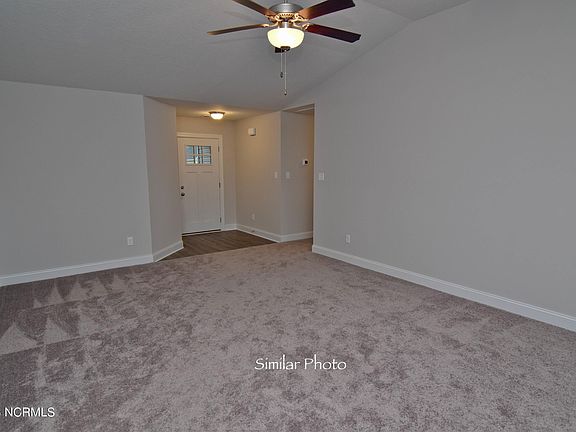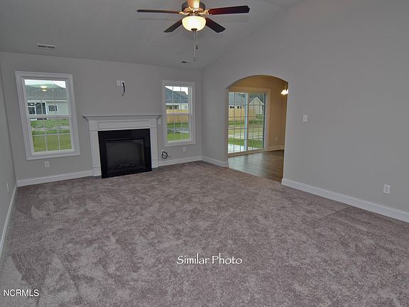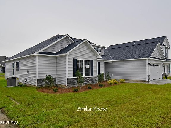 Welcome to the highly desired & popular community of Onslow Bay. Brand new construction built by Onslow County's most trusted & preferred builder, featured in Builder 100/ Top 200 Builders in the country. Onslow Bay is a hot spot, 3 miles to MCB Camp Lejeune's Piney Green gate, 14 miles to New River Air Station & minutes to area schools, shopping & dining. This beautiful neighborhood is sure to impress, complete with a clubhouse area & community pool. Introducing the Brookings floor plan: 4 bedrooms, 2 bathrooms at approximately 1673 heated square feet. The foyer invites you in, opening to the great room. At approximately 14'x20', the great room is large enough to gather for movie or game night. Snuggle up next to the cozy electric fireplace, surrounded by marble and topped with a custom mantle. The kitchen boasts flat panel staggered cabinets with modern granite counters, a pantry, and stainless appliances. Appliances include a smooth-top range, microwave hood, and dishwasher. The open concept of the dining area is the ideal setting for meals or entertaining. The master suite is sure to please with a ceiling fan and a luxurious master bathroom. Complete with two vanities topped with cultured marble counters, full view custom mirror, ceramic tile flooring, separate shower and soaking tub.....all leading to the walk-in -closet. Bedrooms 2, 3, and 4 are perfectly sized and prewired for ceiling fans. This charming floorplan is also complete with a 2-car garage. Call Today! NOTE: Floor plan renderings are similar and solely representational. Measurements, elevations, and specs may vary in final construction. Limited selections for buyer to choose. Call L/A to verify.