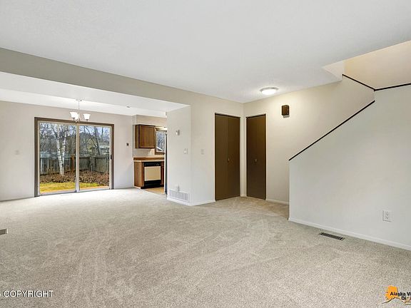 Townhouse style zero lot line home that has recently been refreshed with all new interior paint and new carpet. Located at the end of a culdesac with a very long paved driveway that will hold several vehicles. Partially fenced yard. Just minutes drive to major shopping areas, military bases, Centennial Park, trail systems and easy access to the Glenn Hwy. No HOA dues.