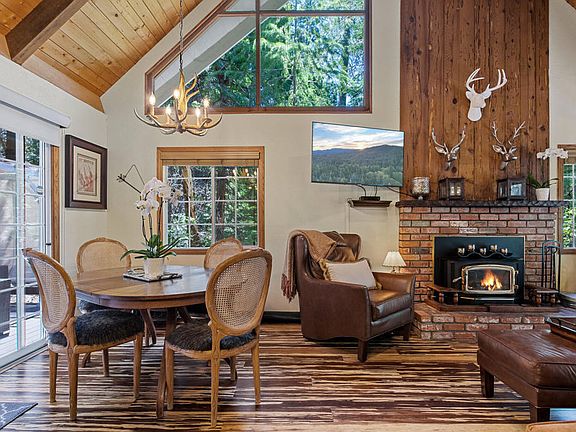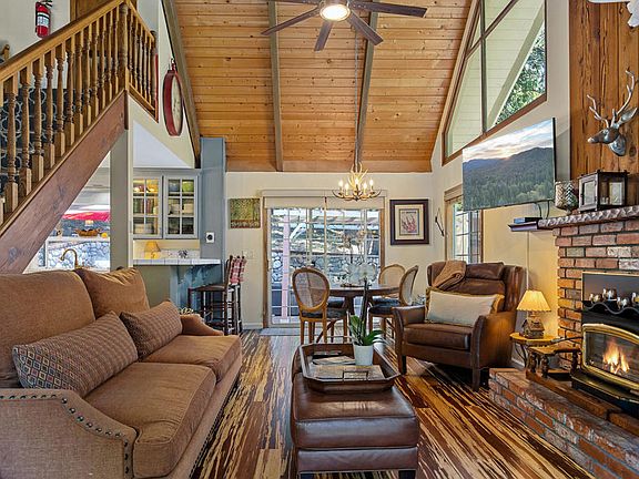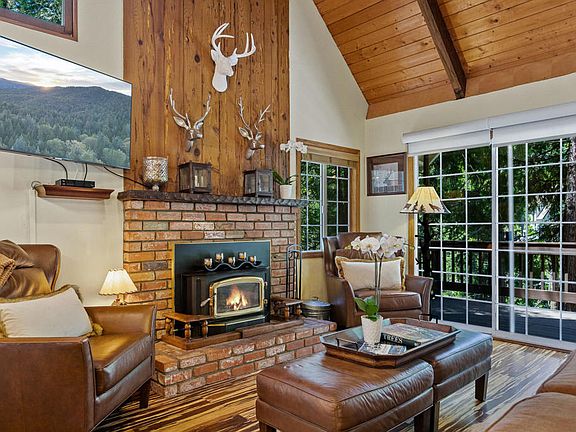 Welcome to your dream escape in the heart of the Lake Arrowhead mountain resort community. This updated chalet-style cabin with Lake Rights offers the perfect blend of rustic charm and modern elegance. With 4 BRs, 3 Baths, and 3 expansive decks, this home is great for both a cozy weekend or a family gathering. Enter through the lower level, featuring two spacious bedrooms with porcelain wood-like tile floors, a stylish Bath, and large laundry rm. The main level boasts soaring vaulted ceilings, wood floors, open kitchen, and a DR that flows seamlessly into a living area centered around a cozy wood-burning stove. Step outside onto the very private back deck, surrounded by cottage-like stone walls under towering Redwoods illuminated by charming coach lights. Ideal for entertaining or simply relaxing. Main level and upper level BRs have ensuite baths. The top floor bathroom features a luxurious jetted tub. Conveniently located just a short stroll from ALA access #11 to the lake trail and within walking distance to the vibrant Lake Arrowhead Village, this home is perfectly situated for both adventure and relaxation. Professionally designed and offered turnkey furnished (per inventory list). Additional storage shed also included. This property is ready for you to move in and start living your best life. Whether you're looking for a primary residence, a vacation home, or an investment property, this Lake Arrowhead cabin is a rare find.