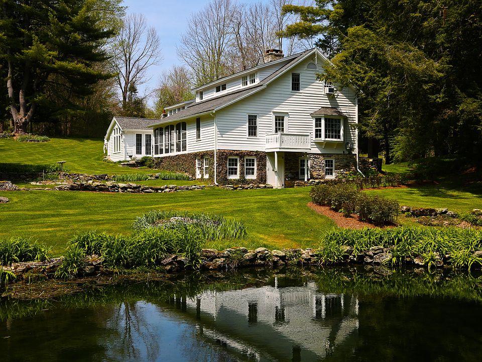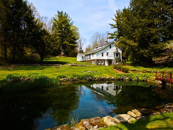 18th century New England farmhouse combining fine original details with modern amenities. Secluded spring fed pond and magical gardens. Fruit trees, blueberry bushes and a grape arbor. A peaceful get away offering privacy and quiet yet close to downtown Great Barrington and all Berkshire attractions. A sun filled eat-in kitchen with French doors that open to the patio and porch.The first floor en-suite bedroom with balcony overlooking pond and incredible gardens. Sitting room, living room, charming dining room with built ins Second floor with 3 bedrooms, full bath and study. A finished walk out lower level has a fabulous functioning stone fireplace. This room is great for use as a study or additional guest space. The red Barn can accommodate horses offer storage or become a workshop!